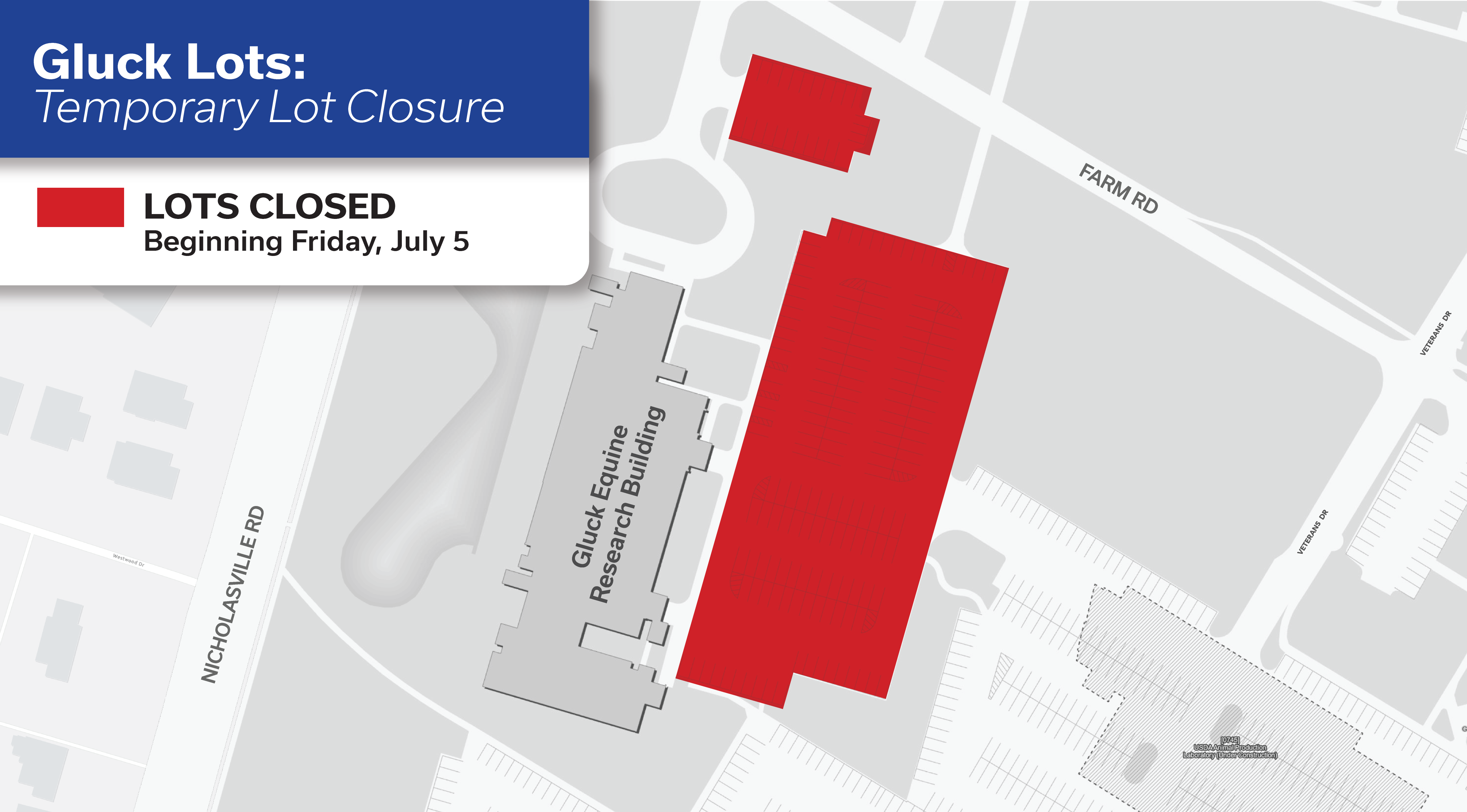The large and small Gluck Equine Center parking lots will temporarily close to facilitate lot maintenance and expansion construction starting at the close of business on Friday, July 5th.