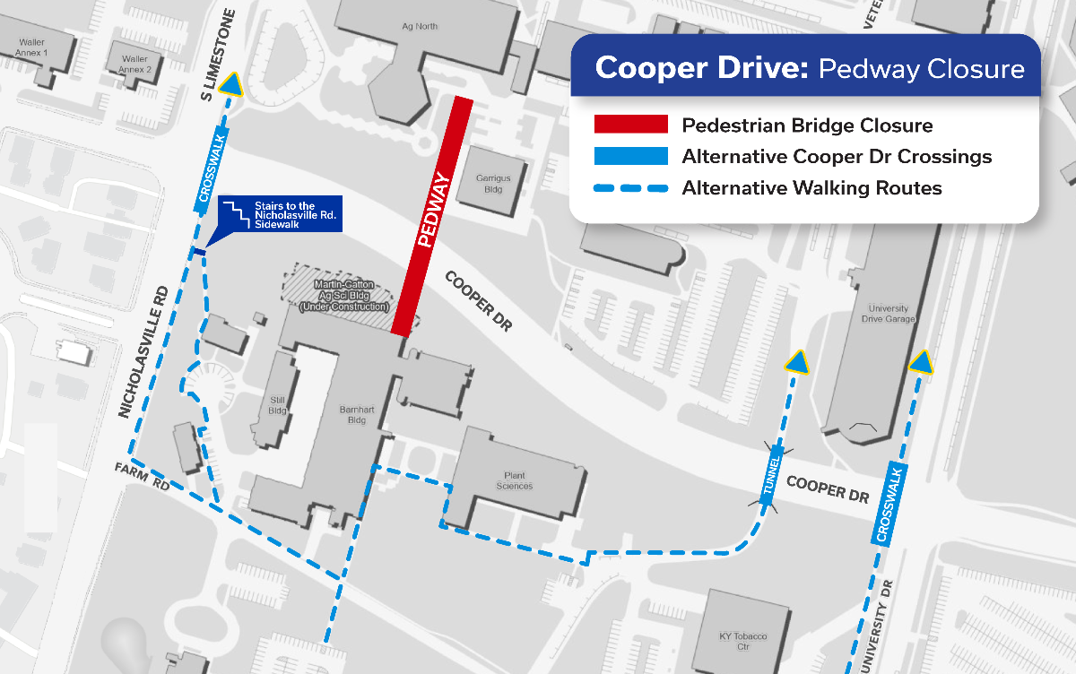 Pedestrians impacted by the closure can choose to use crosswalks at the intersections of University and Cooper drives or Limestone and Cooper drive. Another option could be to use the tunnel that runs under Cooper at Veteran’s Drive.
